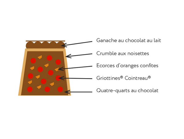 Commencer par mélanger les blancs d’œufs, le sel et le sucre (1) et faire monter au batteur à l’aide du fouet jusqu’à obtenir une consistance de meringue. Mélanger le beurre mou, les jaunes d’œufs et la crème liquide. Ajouter le sucre (2), la poudre d’amande blanche, puis le chocolat fondu. Incorporer ensemble la farine et le cacao en poudre tamisés. Enfin, incorporer lentement la meringue, les écorces d’oranges confites et les Griottines® Cointreau®. Remplir le moule à cake qui contient déjà le crumble aux noisettes cuit. Cuire à 170°C au four ventilé
