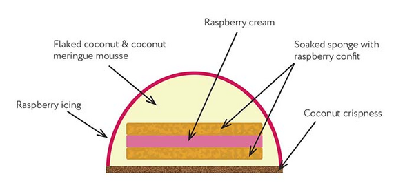 Warm the raspberry puree and the raspberry breakings. At 40°C,