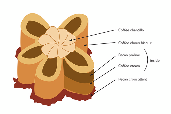 in the shape of flower. Then place vertically the strips of coffee choux biscuit: 5 strips for each flower, following the contours of pecan praline. Fill each petal with coffee cream, then pecan praline. Finally pipe the coffee Chantilly on top of dessert.