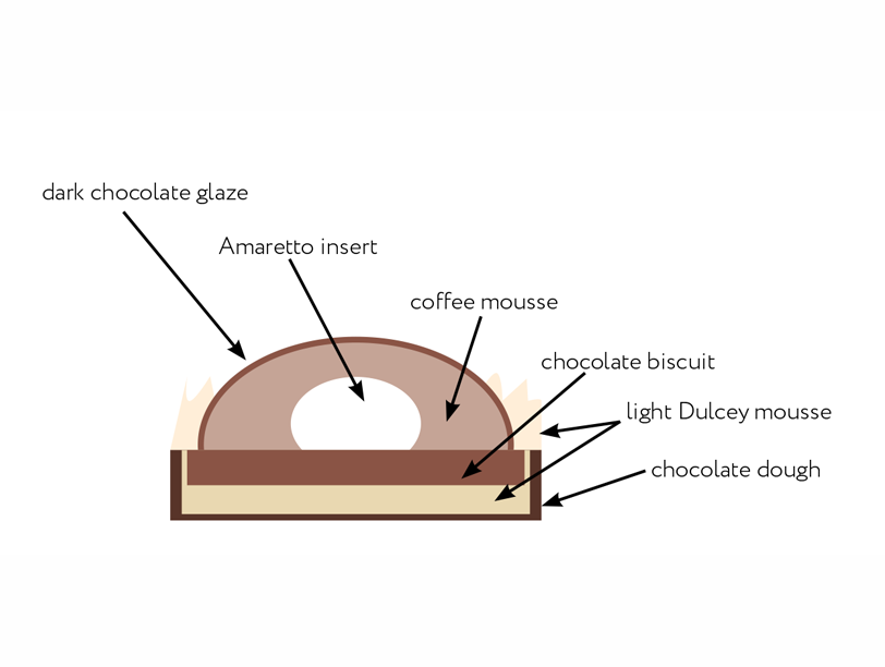 Blend the glaze with a hand blender and use immediately on the coffee mousse dome and Amaretto insert.