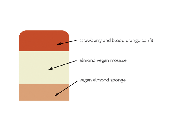 Pour the strawberry and blood orange confit into the finger shaped molds. Pipe in the almond vegan mousse and top with the vegan almond sponge.