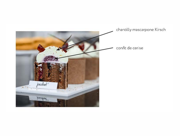 Fouetter la chantilly mascarpone Kirsch et dresser 35 g sur le dessus du confit.
