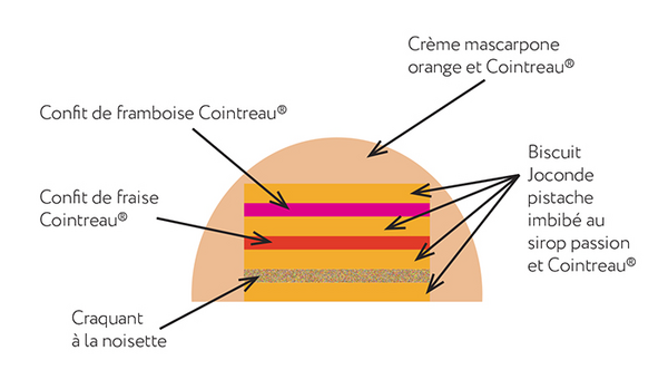de fraise Cointreau®, un biscuit imbibé, le confit de framboise