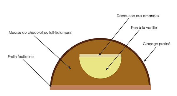vers le bas. Puis couvrir de mousse au chocolat–kalamansi avant de poser un rectangle de pralin feuilletine.