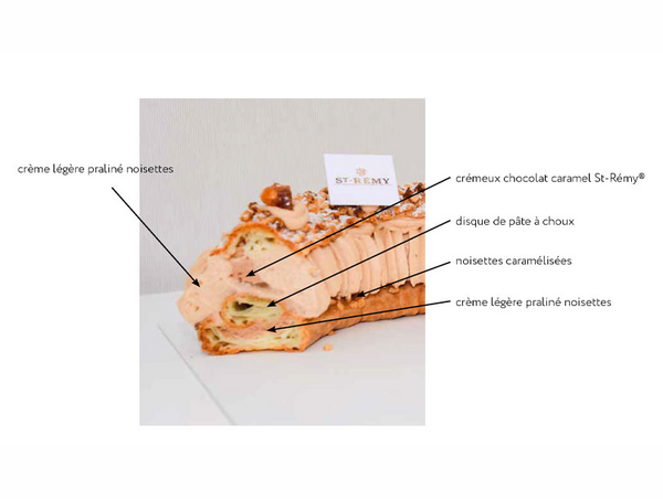 Dans une casserole, faire chauffer le lait et le glucose, verser le tout sur le chocolat de couverture, la pâte de noisette et ajouter la crème fleurette froide et le St-Rémy®. Stocker le crémeux au réfrigérateur pour le montage des Paris-Brest.