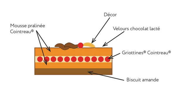 Griottines® Cointreau®. Laisser durcir légèrement et dresser le reste de mousse pralinée au Cointreau®, puis le biscuit amande.