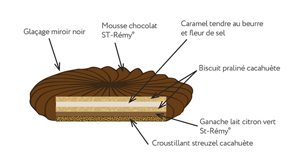 1) Au batteur à l’aide d’une feuille, émulsionner et monter le beurre, le praliné et les jaunes d’oeufs.